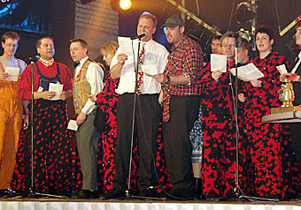 Das Männerballett interpretierte das Lied "Sexbomb" auf eigene Weise. Zünftig in weißen Handwerkeranzügen begann das Schauspiel, bis sich die Agierenden drehten und ihre Rückseite zeigten. Sie hatten auf der Rückseite ihres T-Shirts Frauenoberkörper gemalt. Der Gag kam aber weiter unten: Die Hosen waren an den "A...backen" in Form eines Ausschnittes zugeschnitten, so dass das blanke Fleisch wie ein praller Ausschnitt wirkte. | ||