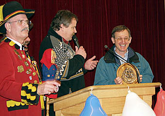 der Stadt. Nach dem Spektakel lud Jules Sailer und der Bürgermeister von Riquewihr zu einem Empfang mit Wein und Cremant ins Rathaus. Die Fasnetspuppe wurde übrigens noch am selben Tag verbrannt. Das nennt man Kompaktfasnet. |