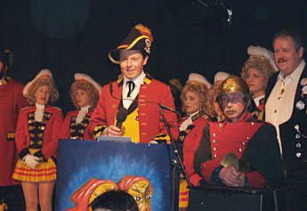Dieses Jahr war die Zunft - vielleicht wegen der starken Kälte - recht pünktlich in der Festhalle. Bevor man unnötig schnattert läuft man lieber schneller! Das diesjährige Hallenmotto heißt "Las Vegas" und dem entsprechend prächtig war auch die Halle dekoriert. Glitzer und Glimmer der amerikanischen Glücksspielstadt wurden hier auf Weil der Stadt übertragen. Nach dem Einlauf - an dessen Schluss dieses Mal die Schlehengeister zu ihrem Narrenmarsch paarweise in die Halle hüpften - begrüßte Karlfriedrich die zahlreichen Gäste und kam nach einigen kräftigen Einlagen der Narrenkapelle auch schnell zur Ordensverleihung an die Ausschussmitglieder, die Gruppenbosse und an weitere verdiente Mitglieder der Hallendeko, der Wirtschaft und der Narrenzeitung. |