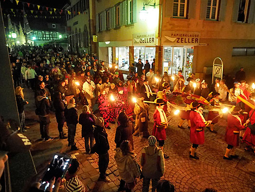 Dann setzt sich der Trauerzug, bestehend aus Narrenkapelle, Ballett und Siebenerrat vom Marktplatz aus zum Speidelsberg in Bewegung .