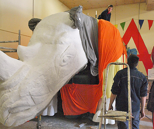 Das riesige Nashorn soll sich am Umzug bewegen, es wirkt noch etwas farblos. Aber am Sonntag ist alles - egal wie spät es wird - fertig. |