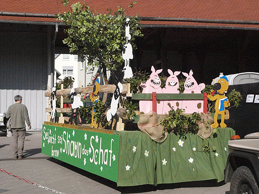 Der Wagen "Shaun, das Schaf" ist schon fertig und geht nun in eine Gerätehalle, bis er am Sonntag zum Umzug gebraucht wird. |