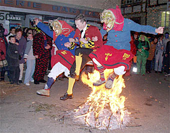 mit ihm durch das lichterloh brennende Feuer. Die Narrenkapelle zog zur Freude des närrischen Publikums unter den Arkaden des Rathauses alle Register ihres Könnens. |