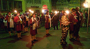 Kurz vor Zwölf erreicht der Zug der Narren mit getragener Musik der Narrenkapelle den Marktplatz. Die "Fasnet" wird symbolisch als Stoffpuppe mitgetragen. Die Narrenfahne, die seit Beginn der Saison geweht hatte, wird nun eingeholt. Dann begleitet der Marsch die "Fasnet" zum Speidelsberg. |