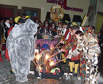 Mehrere hundert Schaulustige warten hier schon, um der Verbrennung der Fasnet beizuwohnen. Die Aktiven der Zunft entflammen nun die Puppe. Schon bald brennt sie lichterloh. Es ist Brauch, dass zum Beispiel ausscheidende Ballettmädchen ihre Handschuhe verbrennen oder andere Gruppen symbolisch einen Teil ihrer Ausstattung ins Feuer werfen. |