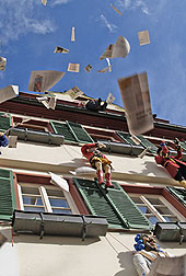 Vor dem Rathaus erhebt der Zunftmeister die vielen Anklagen gegen die Stadtverwaltung und fordert den Schlüssel und die Kapitulation vom Kurzen Sepp..... dieser weigert sich aber beharrlich, die Tore zu öffnen. Deshalb gibt Michael das Zeichen für den Einsatz des Rammbocks! |