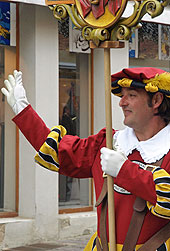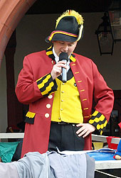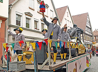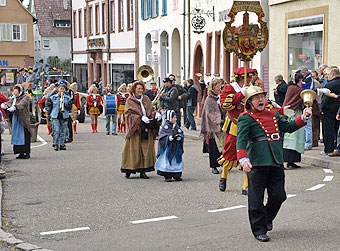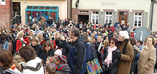 Bei kaltem, aber trockenem Herbstwetter harrte das Publikum am Weil der Städter Marktplatz auf die Narren der Zunft. Pünktlich marschierten die Aktiven am Spittl los und erreichten kurz darauf den Marktplatz, um die Narrenfahne zu hissen. Der Siebenerrat hatte das Thema "Abwrackprämie" und Zunftmeister Daniel I. proklamierte seine 11 Punkte. |