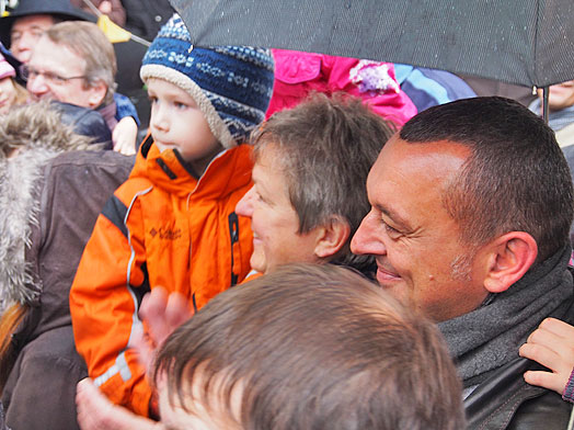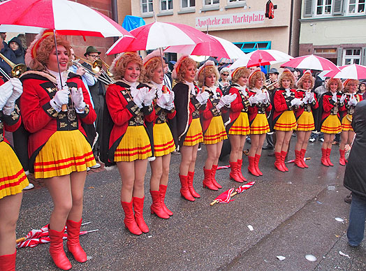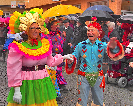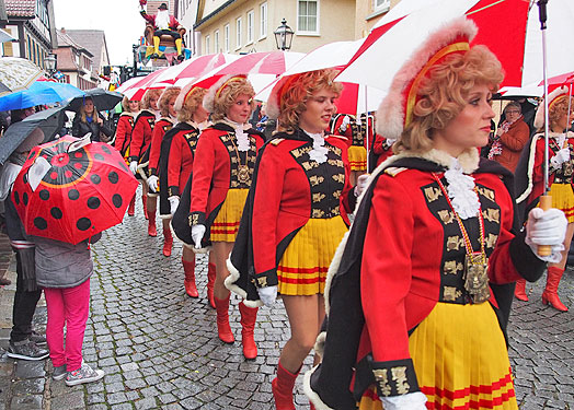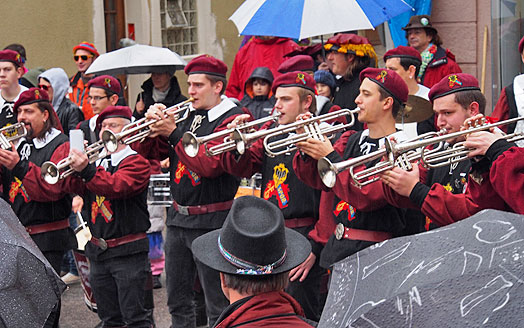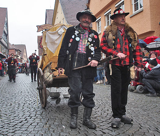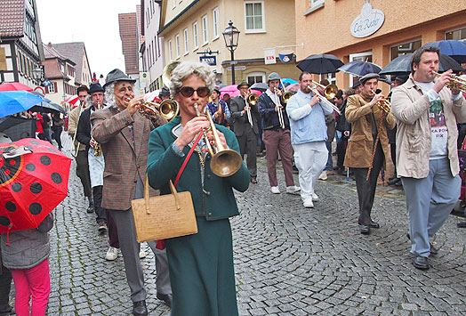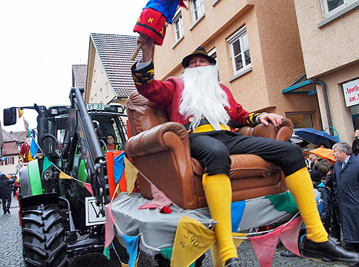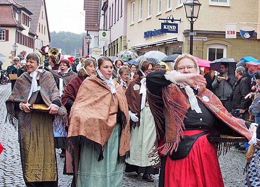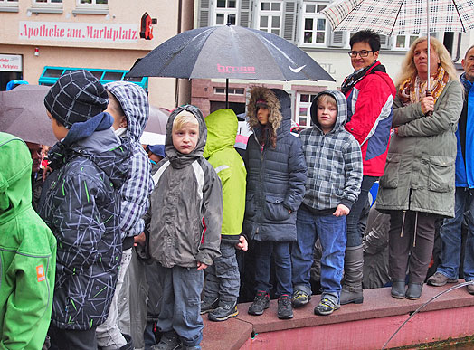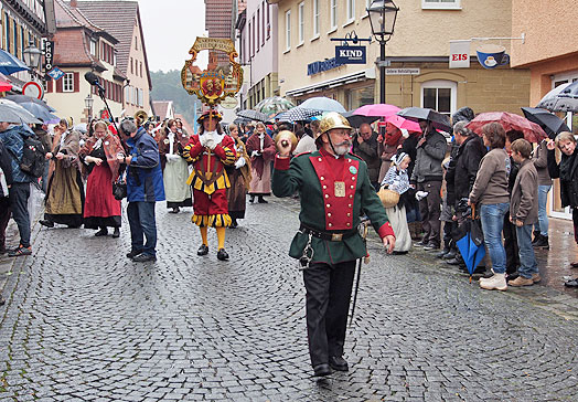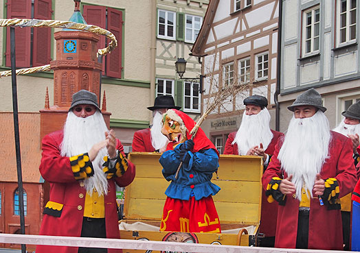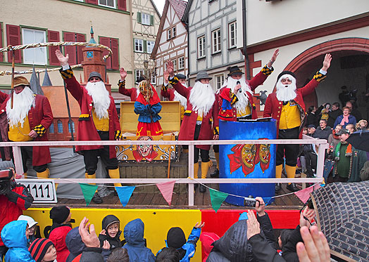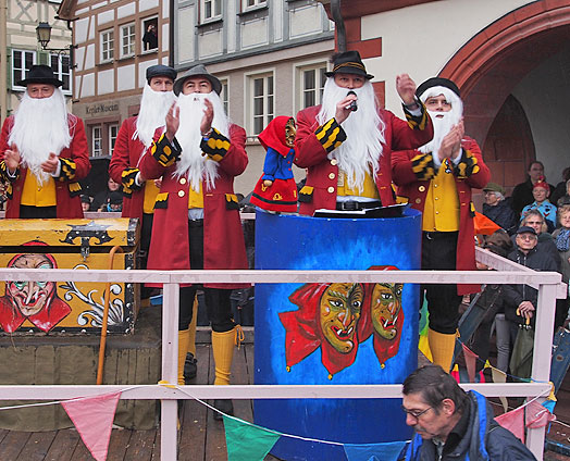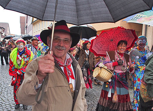 Der jährliche Fasnetsauftakt fand dieses Jahr bei regnerischem Wetter statt. Aber wer glaubt, dass weniger Zuschauer auf den Marktplatz kamen als sonst wird eines besseren belehrt. So kam der kleine Umzug von der Vorstadt herauf - angeführt vom Büttel - in Richtung Marktplatz.