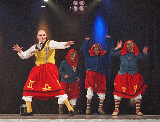 Weil der Programmpunkt "Hexenlied" vom Zunftball so gut ankam, wurde er mit teilweise anderer Besetzung noch mal gespielt: Der Zunftmeister in "Mischkleidung" als Rapper. | ||||
