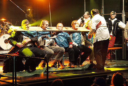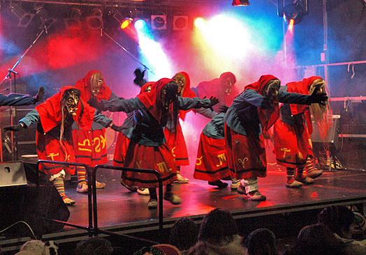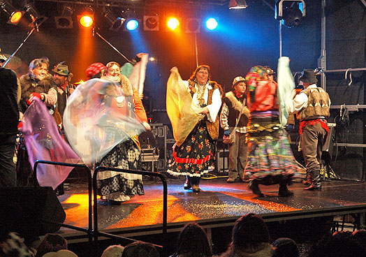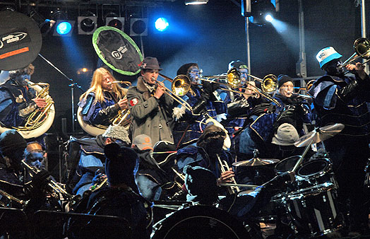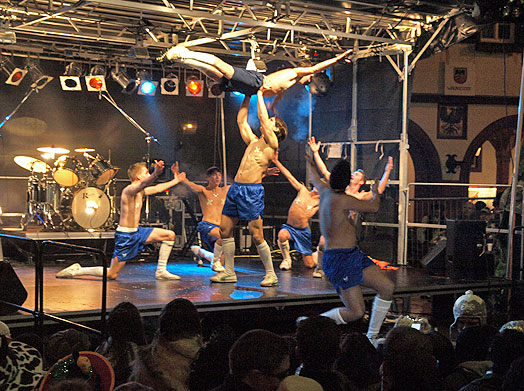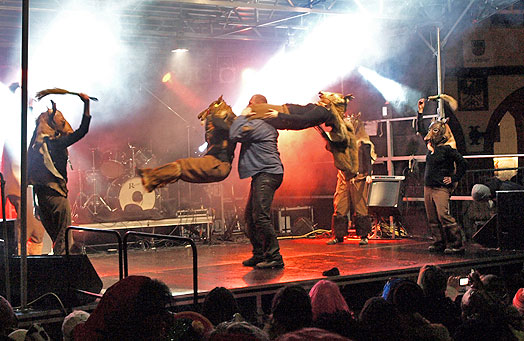 Nun folgte eine nicht programmmäßige Einlage der Narrenkapelle, die ein tänzerisches Potpourri durch viele Titel der Musikgeschichte wagten. Ein besonderes Erlebnis bei 10 Grad Minus und freiem Oberkörper - und dann auch noch Zugabe! | ||||