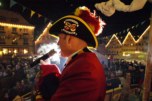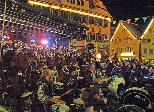 Trotz klirrender Kälte war der Markplatz recht voll und das Publikum machte begeistert mit. Parallel spielten auf dem Speidelsberg die Musikgruppen der Gastzünfte und natürlich der Fanfarenzug und die Mixtour. | ||||