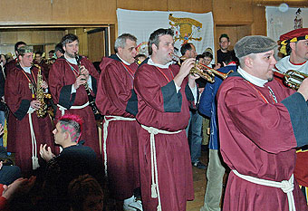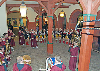 Die Narrenkapelle spielte unter den Rathausarkaden ihr ganzes Repertoire durch. | ||||