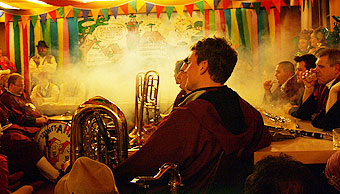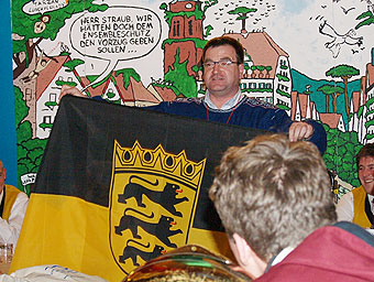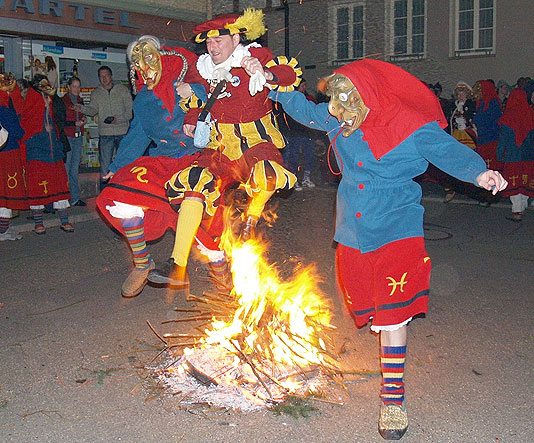 Nach zwei Stunden bewegter Diskussion bei köstlichem Most und Brezeln folgte noch eine gigantische Schunkelrunde. Auf dem Marktplatz trieben schon die Hexen ihr Unwesen und sprangen mit den Besuchern durchs Feuer. |