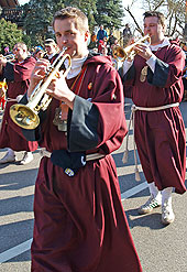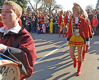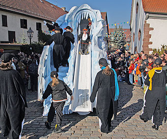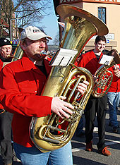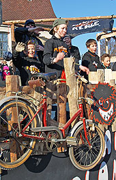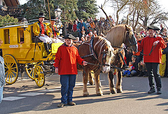 Pünktlich um 14.00 Uhr setzt sich der Zug in Bewegung: Die erste Kapelle sind die "Edafetzer" aus Ehningen, die beste Guggenmusik der Region | Der Herold mit dem Zunftwappen und der Büttel führen den Tross an | |||