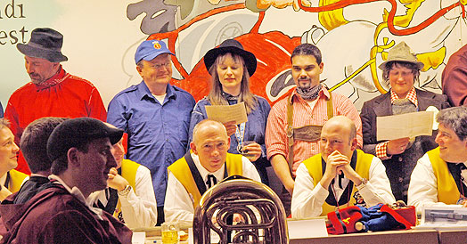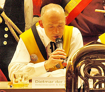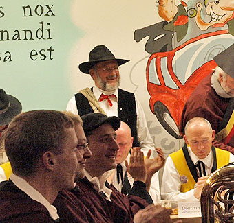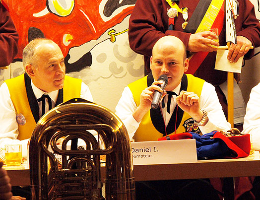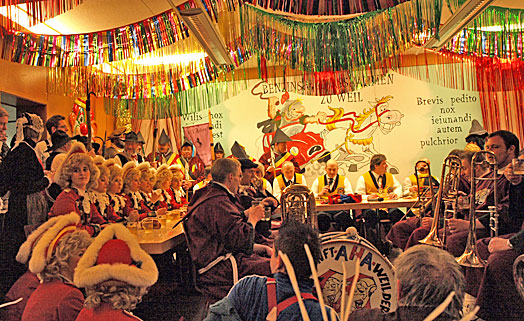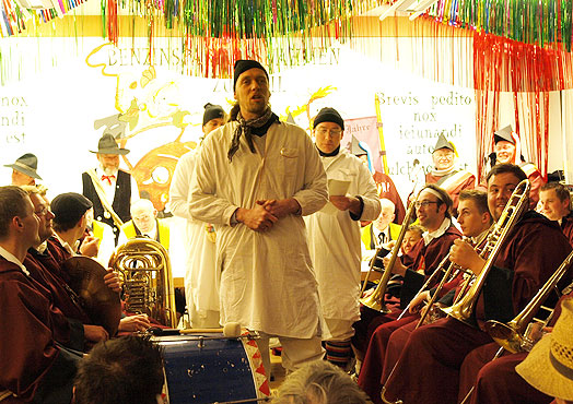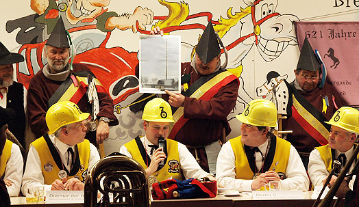 Unter dem Punkt "Verschiedenes" kamen mehrere wohlbekannte Narren mit Schmährufen - wie die Gesellen vor 344 Jahren, denen wir unser Jubiläum verdanken -- in den Sitzungssaal. "Siegle, Siegle, leck mi am Fidle" war vielleicht einer der Rufe, denen die Gesellen im Mittelalter ihre Nacht im Turm verdankten.