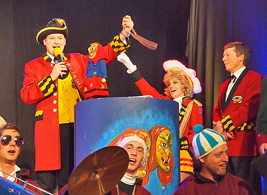 Lange war es unsicher, ob die Veranstaltungen der Narrenzunft dieses Jahr in der Festhalle stattfinden können. Kurz nach 20.00 Uhr lief die Zunft in der ausverkauften Halle ein. Vorstand Michel begrüßte die einlaufende Zunft und übergab Zunftmeister Daniel den ersten Orden, der einen Steckentäler zeigt. Zwischen allen Programmpunkten erschienen immer wieder "Handwerker", die als Parodie auf den provisorischen Zustand der Halle immer wieder versuchten Kleinigkeiten noch fertig zu stellen. Mal bohrte es, mal fiel das Licht aus. |