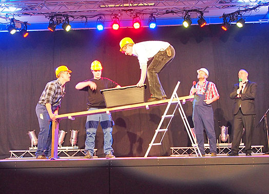Der Wagenbau präsentierte dieses Jahr einen Programmpunkt zum Thema "Baustelleneinrichtung". In witziger Weise wurde der Versuch einer Reparatur der Deckenlampe karikiert.