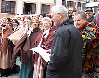 Nach dem Rathaussturm bewegte sich der gesamte Narrentross mit zahlreichen Zuschauern hinunter zum Speidelsberg. Vorstand Karlfriedrich begrüßte die Gäste und würdigte die seitherige Arbeit Gerhard Längerers. |