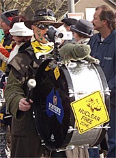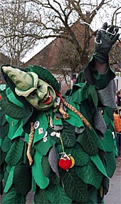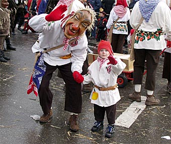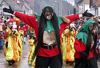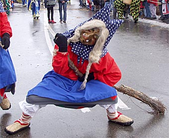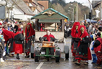 einige Zuflüsse der Donau. Der Umzug begann um 13.33 Uhr und bestand aus 64 Zünften. Steckentäler, Schlehengeister, Zigeuner, Clowns und eine Schellenteufelin bildeten die 35. Zunftsabordnung. Groß war die Freude beim Marbacher Zunftmeister. Der Umzugssprecher stellte unsere Zunft vor und sprach unseren Schlachtruf in kurzen, abgehackten: Aha!!, aha!!, aha!! vor. Klar, dass die vielen aktiven Zuschauer dasselbe abgehackte: Aha!, aha! aha! von sich gaben. Aber es kostete uns keine Mühe, das dortige Publikum mit unserem langgezogenen Ahaaaa, Ahaaaa, Ahaaa zu überzeugen. . |