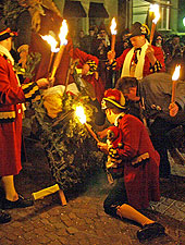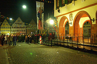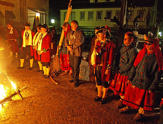 Für Fremde ist es nicht verständlich: Um 24.00 Uhr wird die "Fasnet", eigentlich symbolisch nur eine Puppe, verbrannt und trotzdem versammeln sich Hunderte von Zaungästen, um diesem Ritual zuzusehen. Die Narrenzunft sammelt sich zu den getragenen Melodien der Narrenkapelle kurz vor 24.00 Uhr am Marktplatz und holt die Narrenfahne ein. Dann geht es weiter zum Speidelsberg. Für die Aktiven heißt das, eine sehr schöne gemeinsame Zeit geht zu Ende. Eine Zeit der gemeinsamen Programmgestaltung, eine Zeit des gemeinsamen Wagenbaues, eine Zeit gemeinsamer Ausfahrten oder einfach eine Zeit des gemeínsamen Spasses ist vorbei. Nahezu das Ende eine Glaubensauffassung! Manche verlassen nun die Gemeinschaft, z.B. ein Mitglied des Ballettes verlässt die Gruppe und lässt drei oder fünf Jahre Zeit der gemeinsamen Freizeitgestaltung hinter sich. Das ist ein wirklicher Grund, zu weinen. Kann das ein Außenstehender verstehen? Trotzdem stehen viele Hunderte Zuschauer bei der Verbrennung und glauben dabei sein zu müssen. |