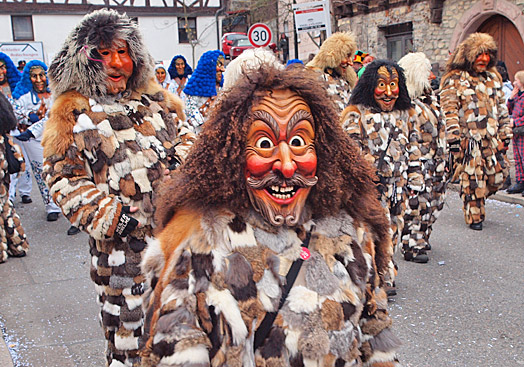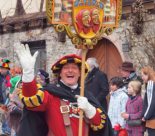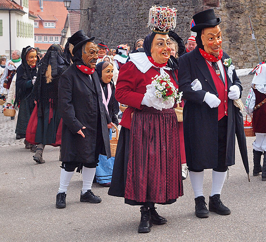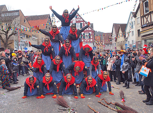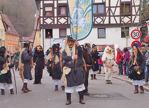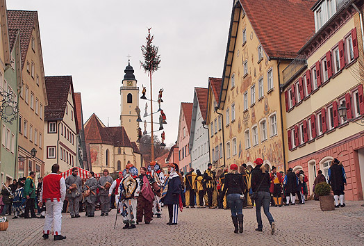 Die Ausfahrt in die schöne Stadt Horb steht regelmäßig auf dem Plan der Narrenzunft. Die Lage der Stadt auf einem Bergrücken und die vielen historischen Häuser machen den Umzug in vielfacher Richtung interessant. Der Narrenzunft war mit zwei Doppeldeckerbussen mit 180 Narren angereist. |