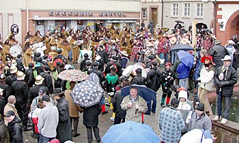 Trotz schaurigem Wetter war auch hier - wie auf dem gesamten Umzugsweg - die Stimmung prächtig und jede Kapelle spielte nochmals eine Schunkelrunde. |