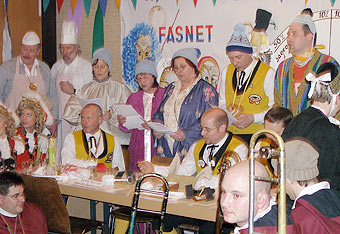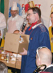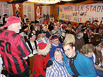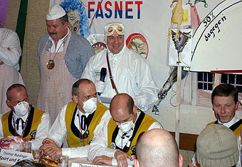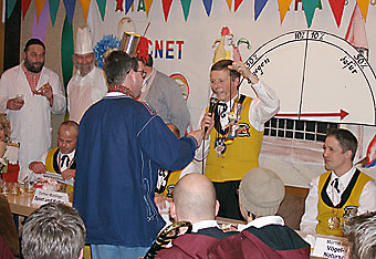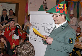 Schon sehr frühzeitig war dies Jahr der Sitzungssaal mit Gästen gefüllt. Um halb sieben gab es nur noch Stehplätze! Mit gehöriger Verspätung traf die die Zunft im Sitzungssaal ein. Man entschuldigte die Verspätung mit der Vogelgrippe. Der "Spickler", war grippal angeschlagen gefunden worden und man hatte ihn im Gasthaus Kepler desinfiziert. |