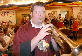Eine Schunkelrunde der traumhaft spielenden Narrenkapelle sorgte für prickelnde Stimmung vor der Sitzung: Michel ehrte im Vorfeld die Presse, die Spicklings-weiber und den Mostspender Franz Decker. Ebenfalls einen Orden erhielt EX-Bürgermeister Straub, der die Fasnet mit allen Mittels unterstützt |