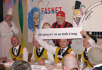 Der Vertreter des Sportvereins bittet die Räte der neuen Regierung um Mithilfe, die zähen Regularien der Amtsvorgänge zu lockern. Das Publikum war mit drei periodischen Sprechgesängen eingebunden. "jetzt gang m'r au bloß weg" |
