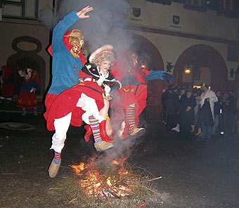 Nach einer zünftigen Schunkelrunde ging es nach zweieinhalb Stunden Sitzung hinunter zum Feuer der Hexen. Wild ging es nun zu! Die Hexen griffen sich Passanten und Ballettmädchen und sprangen mit ihnen durch das wild lodernde Feuer! Die Nacht des "Schmotzigen Donnerstag" währte lange und endete für viele im Spittel, den der Sportverein bewirtschaftete. |