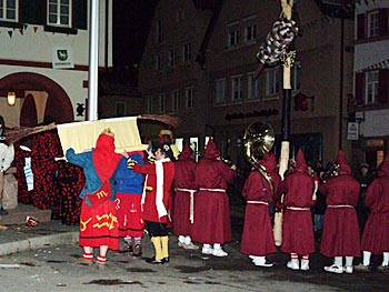 In einem Trauerzug zu getragener Blasmusik, die durch Mark und Bein ging, zog der Narrentross nun hinunter in Richtung Speidelsberg.