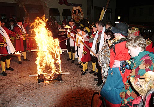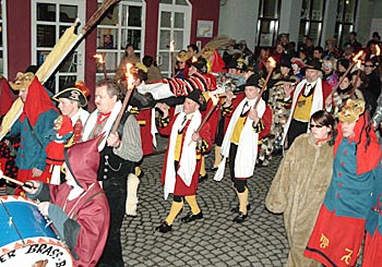 Kurz vor Mitternacht marschierten der Siebenerrat mit Narrenkapelle und Ballett zum Marktplatz und holten traditionsgemäß die Narrenfahne ein. Die Saison 2003/2004 ist damit zu Ende! |