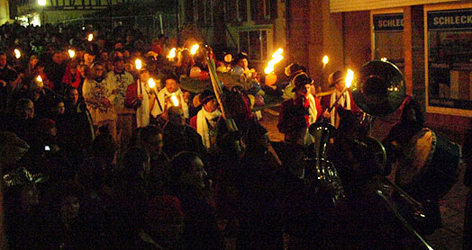 Danach führt ein Fackelzug hinunter zum Speidelsberg. Mittendrin liegt die "Fasnet" in Form einer Puppe auf einer Bahre. |