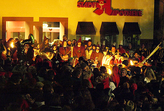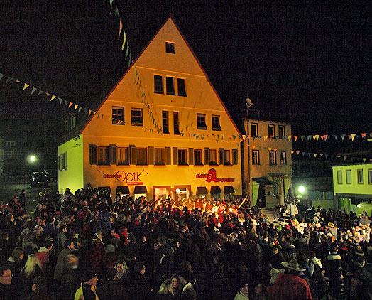 Traditionsgemäß sammeln sich die Narren kurz vor 24 Uhr auf dem Marktplatz und nehmen zur Trauermusik der Narrenkapelle (moll und langsam) die Narrenfahne ab.
