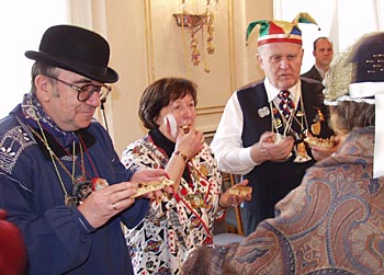 Nach der Begrüßung wurden wir in das Innere der Villa gebeten. An Essen und Trinken fehlte es uns nicht. Beim aufmerksamen Servicepersonal und beim Zeremonienmeister bemerkte man eine gewisse Freude, auch einmal mit echten Narren zusammen zu sein. | ||||