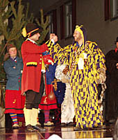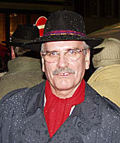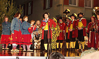 Rede. Das Bild rechts zeigt unseren Zunftmeister Dieter I., dem das Stück nebenbei auch gewidmet war. Er darf das Hexenhäs am Fasnetsdienstag tragen. Heftiger, anhaltender Applaus belohnte die Weiler Hexen für ihren Auftritt. |