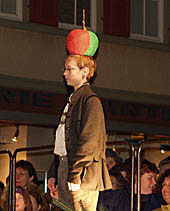 des Zunftmeisters, Lampenmasten ersteigen würde. Ein Narrenökonom würde ihm zwar gerne helfen, scheut sich aber, da er wirtschaftlich vom Narrenrat abhängig ist. Glücklicherweise trifft Wilhelm Tell zu der aufgebrachten Menge und rettet den Schlotterer. |