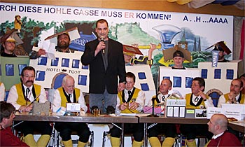 Durch seinen Wahlspruch "Wem kersch au Du?" und die Tatsache, dass Rentner nichts mehr kosten, konnte er so viele Stimmen gewinnen, dass er einstimmig zum Nachfolger von Dr. Klaus Rückert gewählt wurde. Die Sitzung dauerte bei bester Stimmung eine Stunde länger als üblich. |